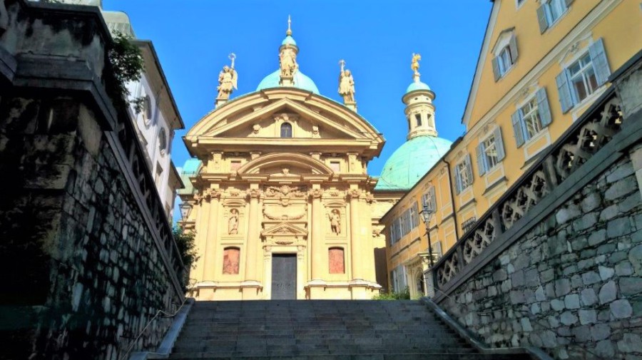 Mit ihren markanten Doppeltürmen ist Wallfahrtskirche Mariatrost im Osten von Graz weithin sichtbar. Von der Statue des Heiligen Josef mit dem segnenden Christuskind am Fuß des Hügels führen mehr als 200 Stufen steil hinauf zur Basilika, die ihren Ursprung im 17. Jahrhundert hat: Grundsteinlegung für Kirche und Kloster erfolgte 1714.