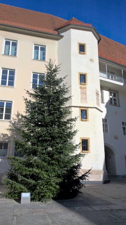 Turm der Doppelwendeltreppe, davor ein Weihnachtsbaum. © 2016 Reinhard A. Sudy