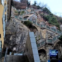 2004/2016. 260 Stufen führen im Herzen der Altstadt vom Schloßberplatz auf den Schloßberg. Wer nicht den Lift im Berg oder die neu gestaltete und transparente Schlossbergbahn benützen möchte, kann über diese schier endlosen Stufen hinauf bis zum Plateau des Herbersteingartens und weiter bis zum Uhrturm steigen. Von der Murpromenade sieht man zwischen der Dreifaltigkeitskirche und dem Palais Attems hindurch wunderbar auf den steilen Aufstieg und den Uhrturm. Faszinierend auf dem Weg nach oben ist aber auch, vielleicht bei einer kurzen Verschnaufpause, der Blick zurück und hinunter auf die Gebäude- und Dach-Szenerie. Österreichische Pioniere und russische Kriegsgefangene haben den ursprünglich als „Russensteig", von der Bevölkerung heute als „Kriegssteig" bezeichneten, teils in den Fels gehauenen Weg im Ersten Weltkrieg (1914-1918) errichtet.