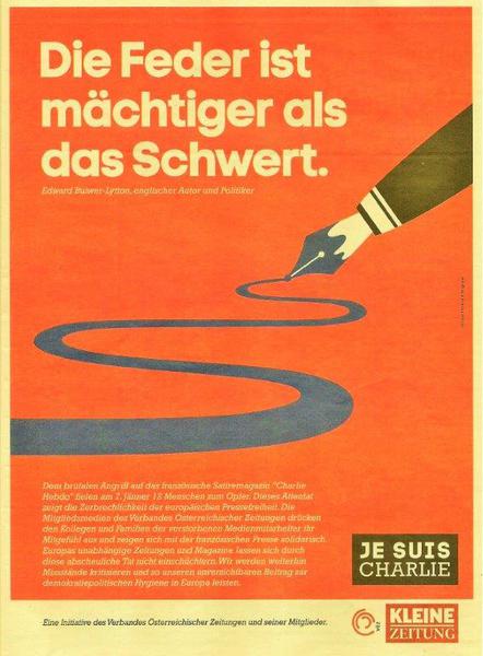 Die beiden folgenden Bilder sind eine Art medialer Nachschlag und der Kleine Zeitung vom 14. Jänner 2015 entnommen. Das linke Bild zeigt die die Cover-Seite mit der Titelseite der druckfrischen Ausgabe von Charlie Hebdo: Ähnlich hielten es auch andere österreichische Tageszeitungen, als Zeichen der Solidarität und für die Meinungsfreiheit. Das rechte Bild aus dem Inneren der "Kleinen" ist eine Initiative des Verbandes Österreichischer Zeitungen und seiner Mitglieder.