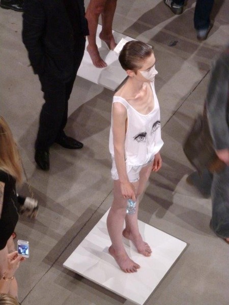 Juli 2013. Bei der sommerlichen Berliner Fashion Week hat der Designer Patrick Mohr seine neue Kollektion "Human" präsentiert: In einem heruntergekommenen, baufälligen Gebäude in Berlin Mitte an der Ecke Brunnenstraße und Veteranenstraße. Die Models standen verteilt in einer hohen, säulengestützen Halle auf sicherlich unbequemen Podesten, um sie herum, zwischen drinnen und oben auf einer Galerie das Publikum.