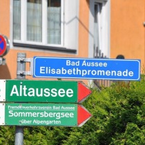 Ausgangspunkt meines Ufer-Spaziergangs die Altausseer Traun flussaufwärts ist die Postbrücke zwischen dem Kurhausplatz und dem Oppauerplatz in Bad Ausseee. Nach einigen Schritten an der Häuserfront der Wiedleite entlang folgt ein Reigen von 'prominenten' Promenaden, die mich bis zur Seeklause am Altausseer See bringen: Erzherzog Johann, Elisabeth und Klaus Maria Brandauer Promenade. Die grün gesäumte, schmale - und derzeit am Beginn bereits gesperrte - Erzherzog Johann Promenade folgt teils auf einer Anhöhe dem Flussbogen, fällt dann ab zur Ischler Straße und wird auf der anderen Seite zur verkehrsberuhigten Elisabeth Promenade. Auf einem Wegweiser steht hier 'Weg Nr. 12 nach Altaussee 1 Stunde'. Ich spaziere gemütlich meist nahe der Altausser Traun weiter, vorbei an Häusern und kleinen Brücken, und wechsle nahtlos auf die Klaus Maria Brandauer Promenade, die den vielen Windungen der Altausseer Traun folgt. Knapp vor ihrem Ende führt ein Steg über den Trattenbach, dann ist eine Bushaltestelle an der Landesstraße erreicht, und ich wechsle die Straßenseite. Links führt eine Gasse durch ein kleines Siedlungsgebiet ans Ziel, ich halte mich aber lieber rechts und folge dem Fahrweg - nun am linken Flussufer - bis zur Seeklause des Altausseer Sees unmittelbar vor dem Hotel Seevilla.